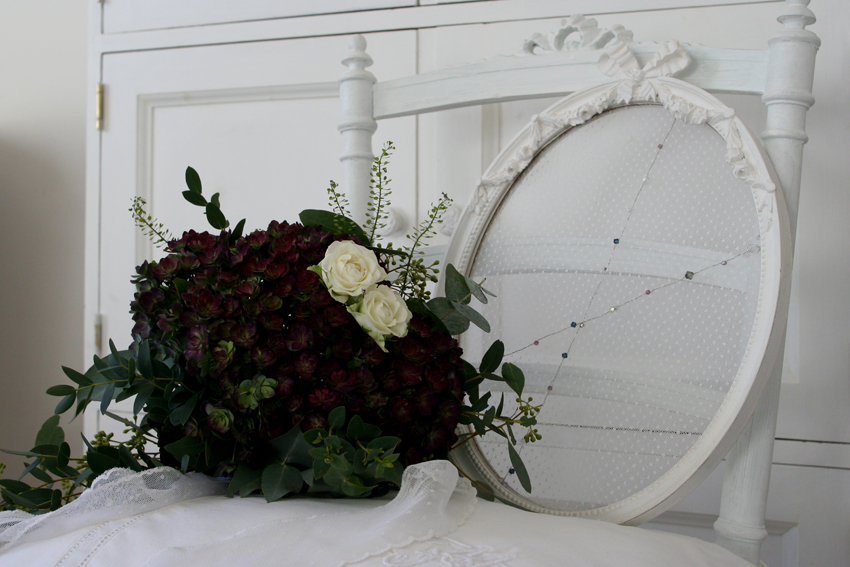Le joli cadre délicatement sculpté, nous a inspiré un décor tout en légèreté: plumetis et pois nacrés.