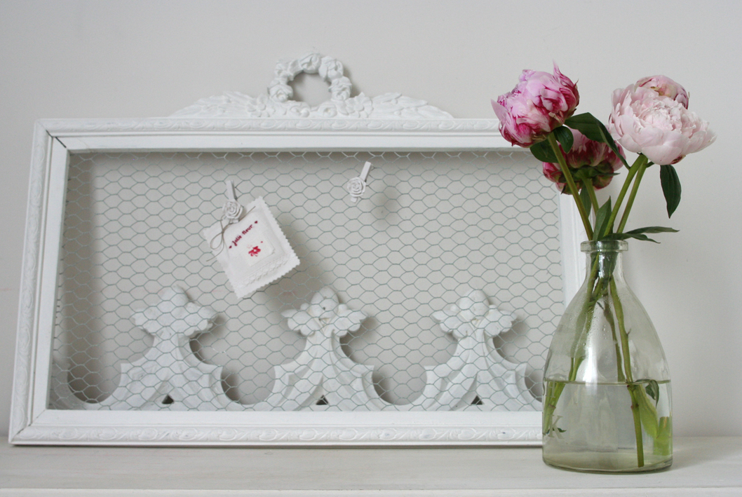 Le cadre ancien délicatement travaillé était nu, nous l’avons revêtu d’un grillage pour qu’un coussinet vienne s’y poser tel un pétale de bonheur.